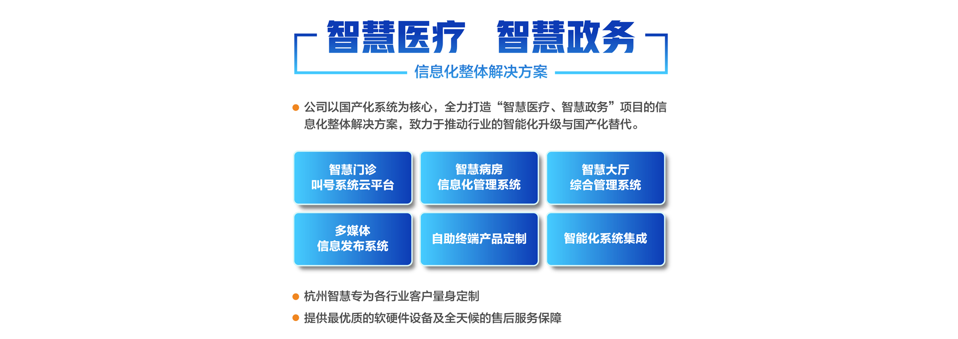 杭州智慧科技有限公司初創(chuàng)于2003年,總部位于重要的電子商務中心中國杭州公司主營業(yè)務有:智慧分診叫號系統(tǒng)、智慧病房醫(yī)護對講系統(tǒng)、智慧大廳綜合管理系統(tǒng)、智慧政務管理系統(tǒng)、智慧多媒體信息發(fā)布系統(tǒng)、導診系統(tǒng)及各自助終端產(chǎn)品定制。專為各行業(yè)客戶量身定制。公司已有20余年行業(yè)經(jīng)驗沉淀積累,擁有優(yōu)秀的產(chǎn)品外觀設計師和各類中高級專業(yè)技術工程師,確保所研發(fā)的產(chǎn)品具有行業(yè)領先的外觀及可靠的技術性能。并擁有權威部門頒發(fā)的各類知識產(chǎn)權及專利證書,30多項資質(zhì)證書、800多個合作伙伴、2000多個項目成功案例經(jīng)驗。 智慧產(chǎn)品已遍及全國各醫(yī)療、政務、金融、通訊、公安、工商、稅務等行業(yè),形成以“立足杭州、輻射長三角、拓展全國”的戰(zhàn)略發(fā)展格局,產(chǎn)品經(jīng)過歷年不斷創(chuàng)新,形成專業(yè)化、平臺化,致力于成為智慧產(chǎn)品的領軍企業(yè)。 公司建立了完善的技術培訓及售后服務中心,并設24小時熱線咨詢電話解答用戶反饋的問題。同時應客戶要求定期派技術人員到 全國各地進行技術指導輔助用戶正確使用智慧產(chǎn)品并能獨立安裝、調(diào)試、日常維護等工作。提供最優(yōu)質(zhì)的設備及全天候的售后服務保障,智慧永恒不變的服務宗旨——致力于客戶的滿意與成功!...